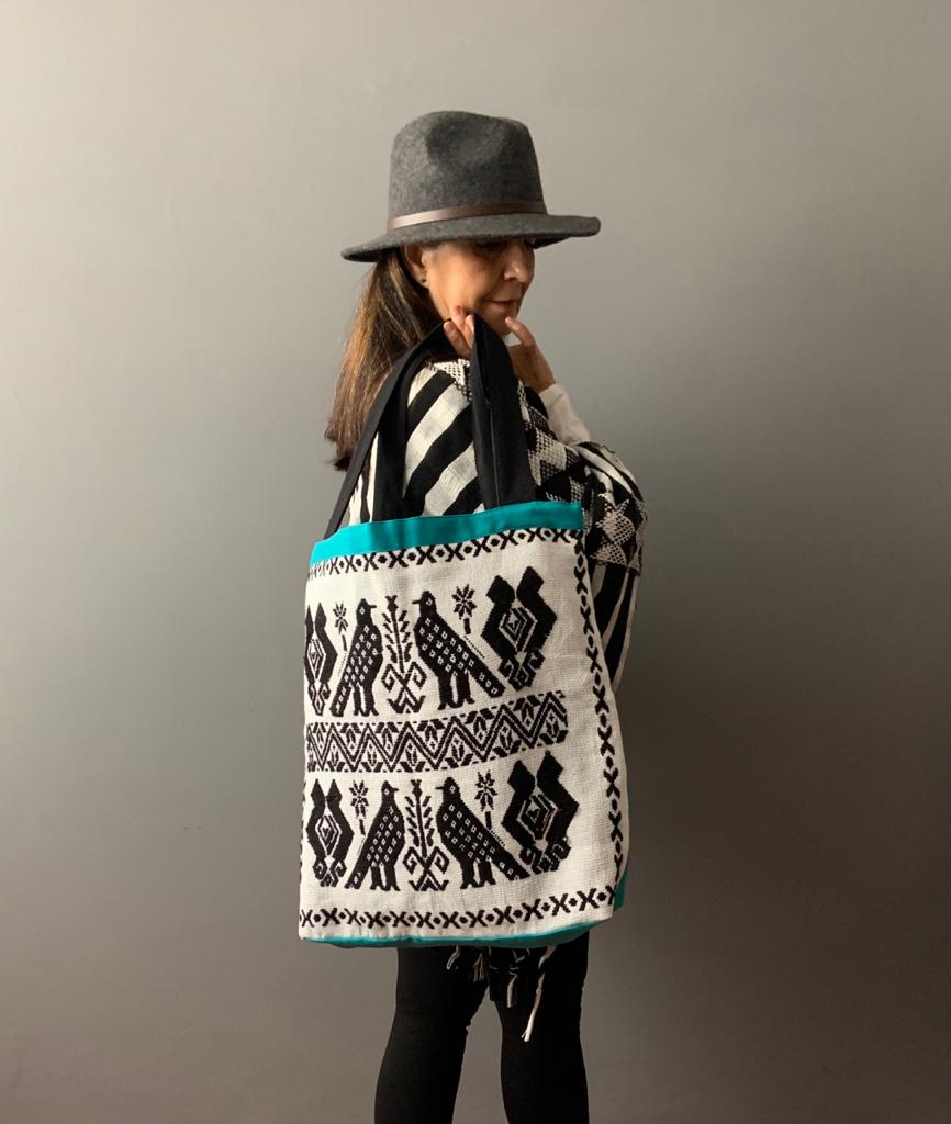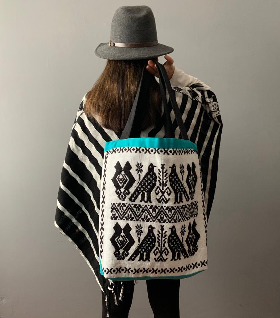 Bolsa de algodón bordada a mano por comunidades Mazahuas. Estado de México.