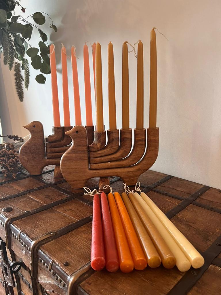 Velas artesanales de cera de abeja en diferentes colores (marfil, vino, salmón y miel).
