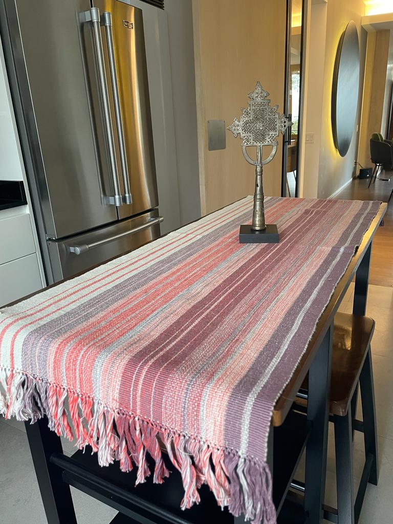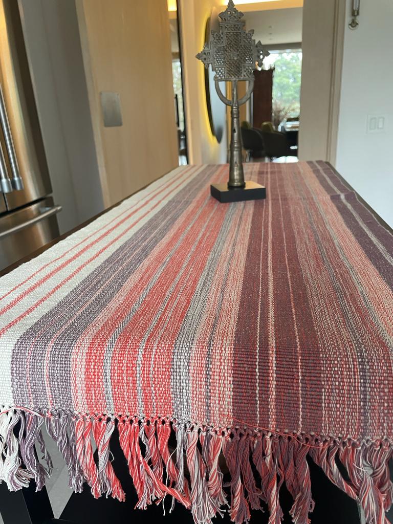 Camino decorativo, tejido en telar de pedal con técnica de matizado a través de un conteo  preciso de hilos. Elaborado por comunidades mayas  de Zinacantán, Chiapas.