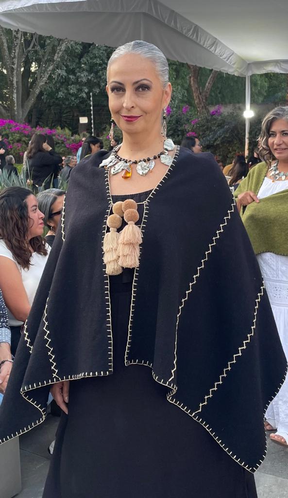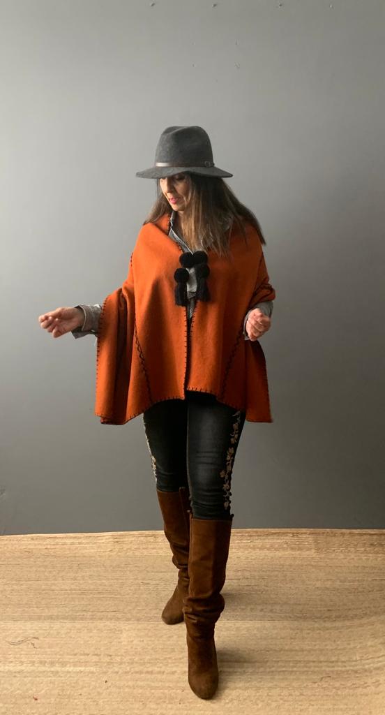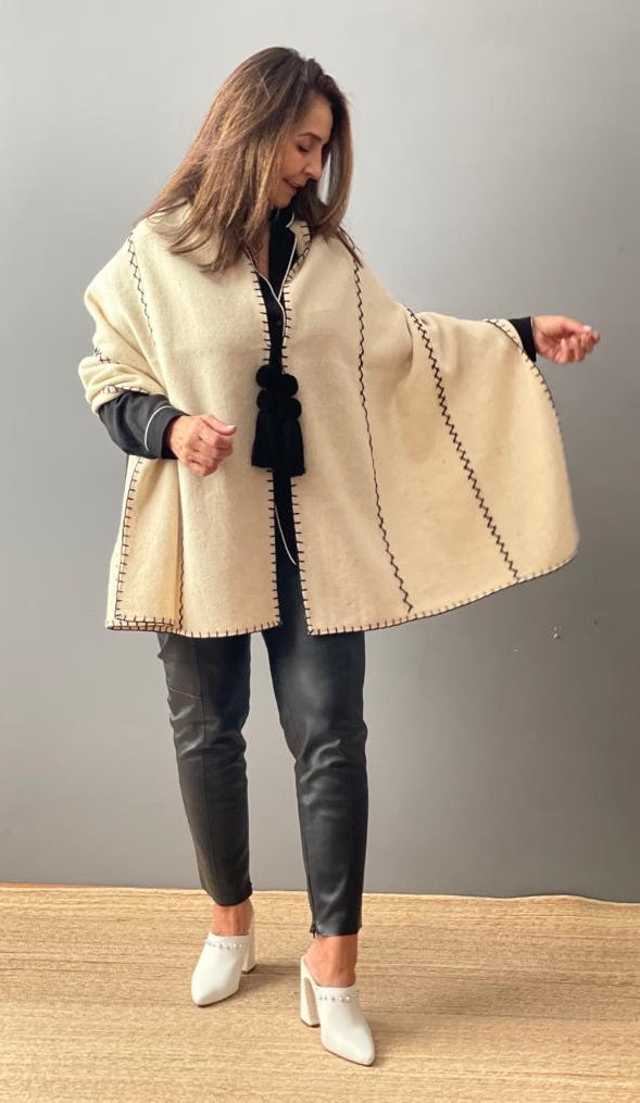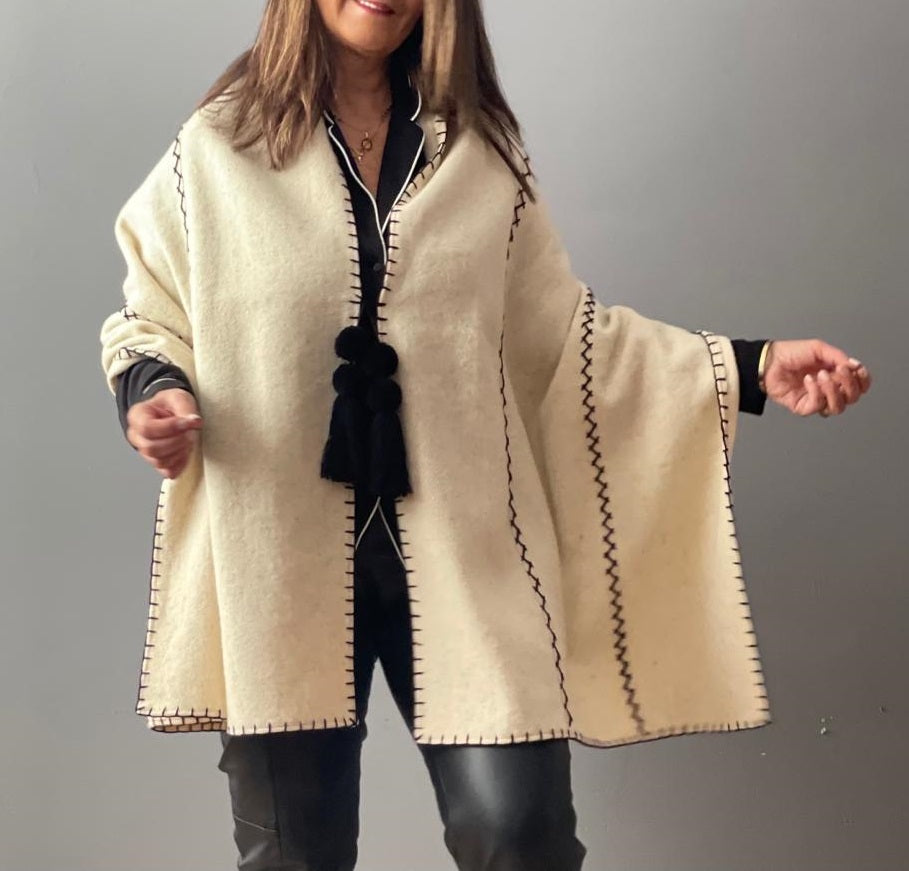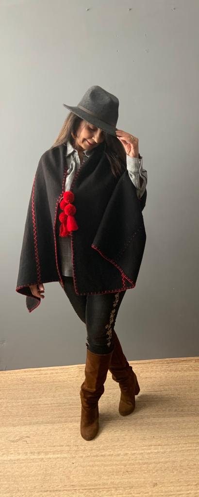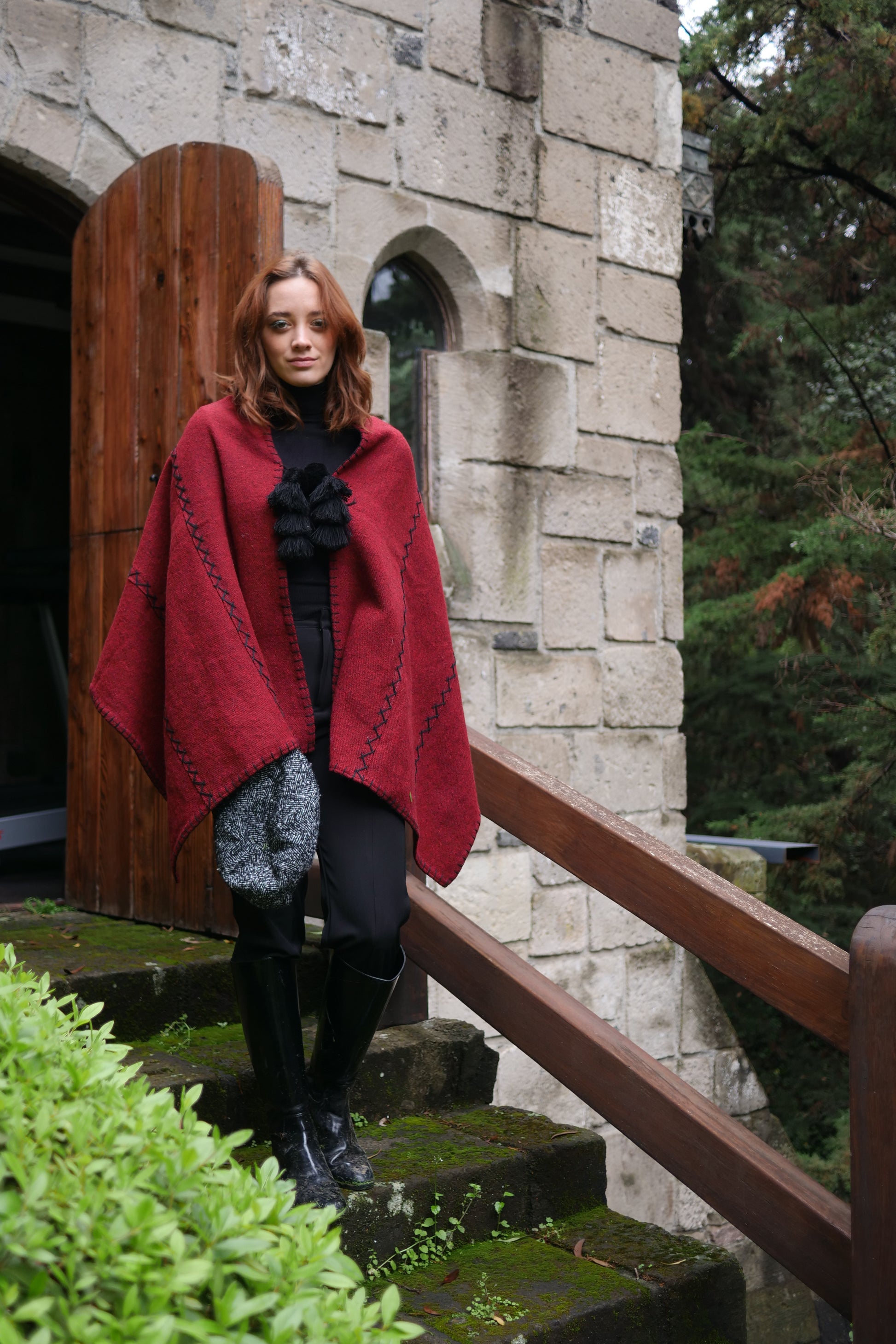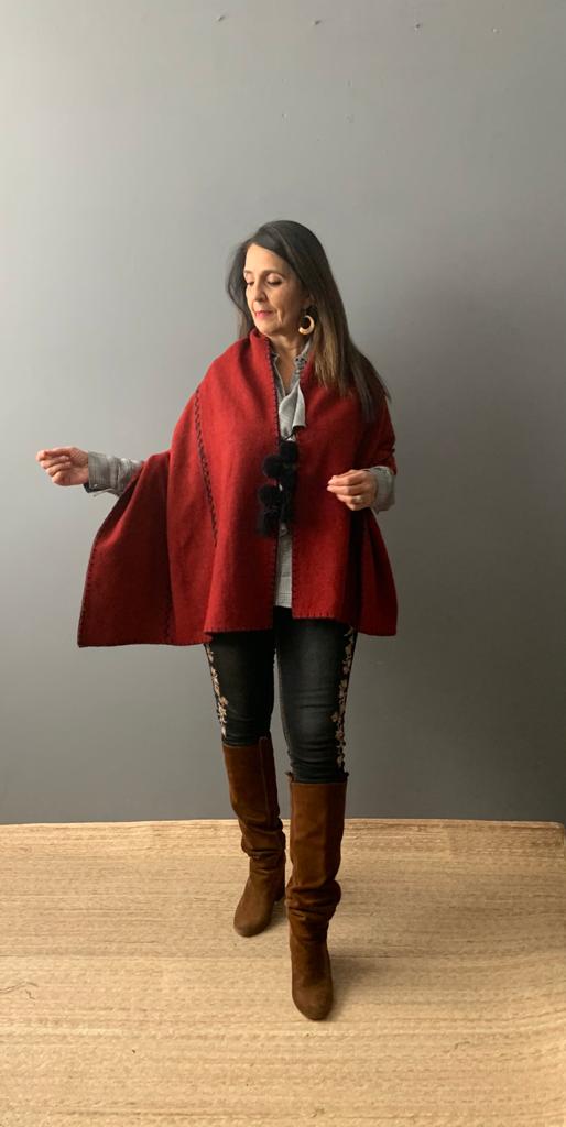Capa con pompones al frente y detalles bordados. El proceso artesanal de esta prenda consta de seis pasos: trasquila del borrego, cardado de la lana, hilado en malacate, tejido en telares de pedal, teñido a mano y acabado final. Elaborada por grupos mayas (tzeltales) de los Altos de Chiapas.