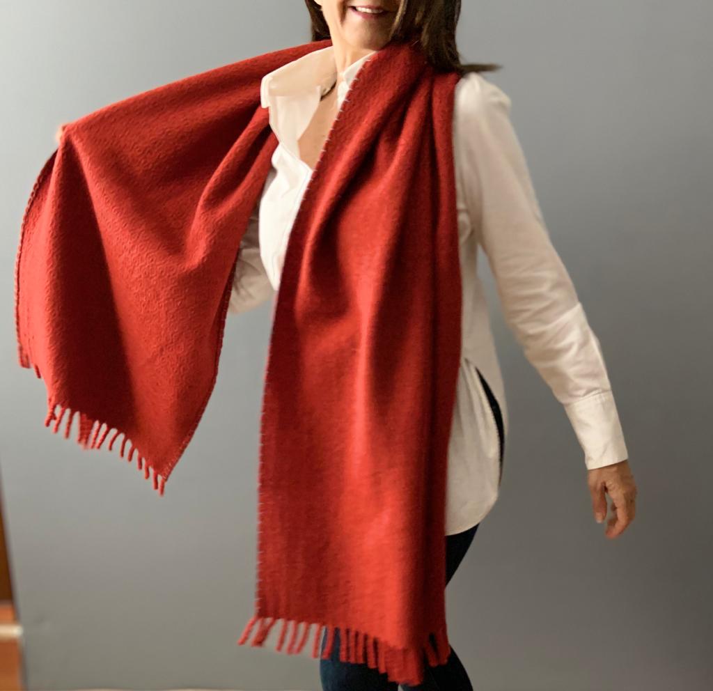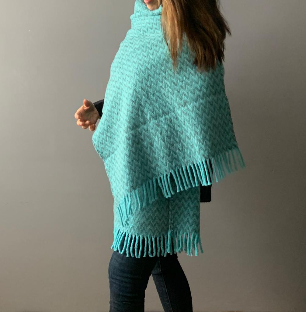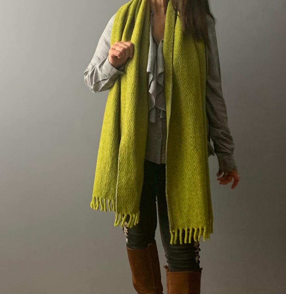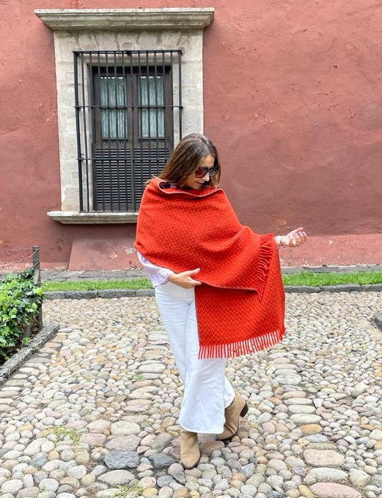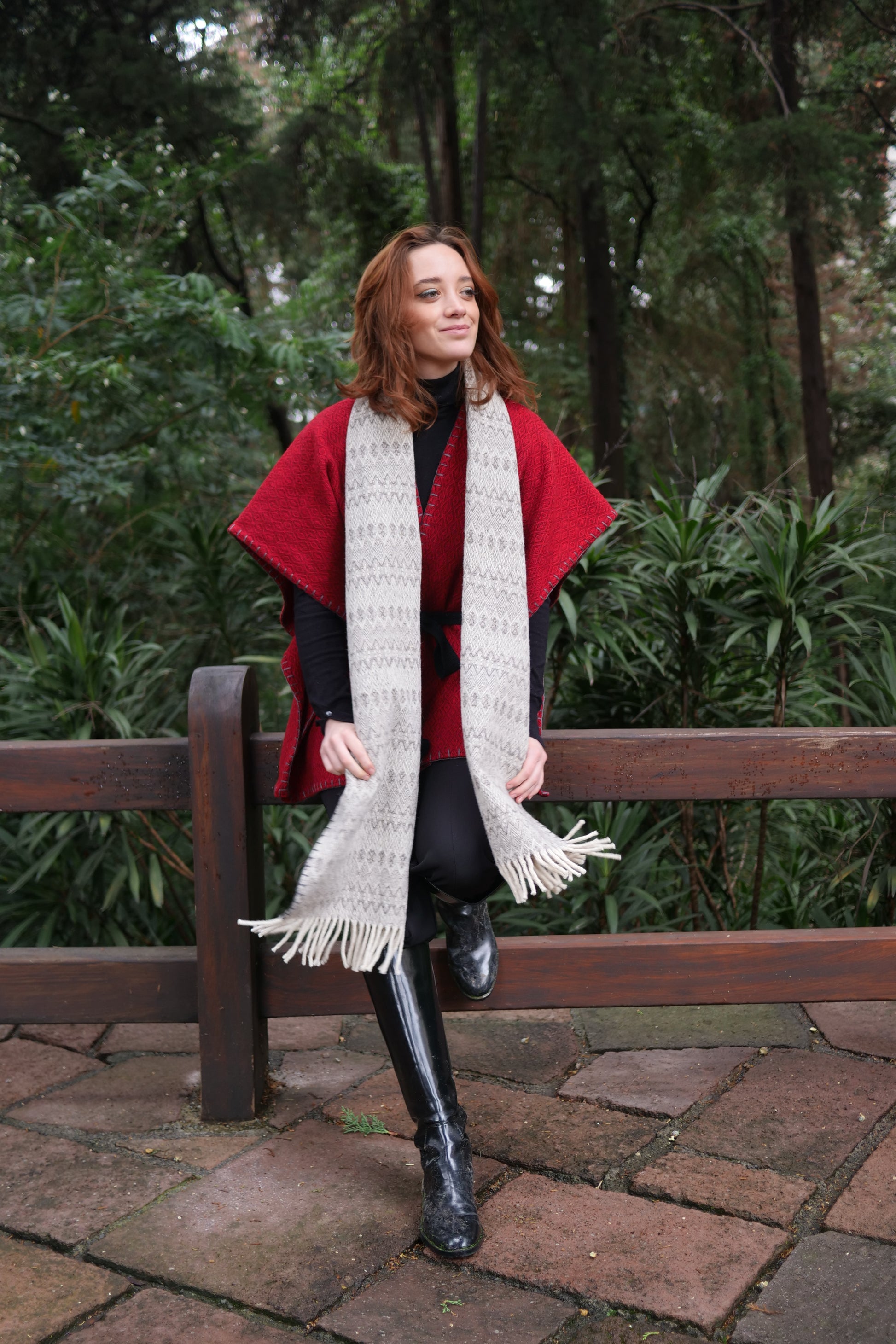 Bufanda o chal con punta trenzada. El proceso artesanal de esta prenda consta de seis pasos: trasquila del borrego, cardado de la lana, hilado en malacate, tejido en telares de pedal, teñido a mano y acabado final. Elaborada por grupos mayas (tzeltales) de los Altos de Chiapas.
