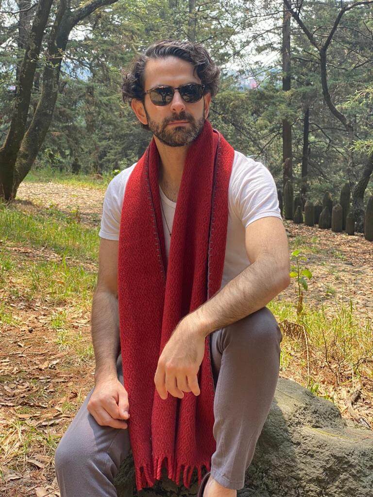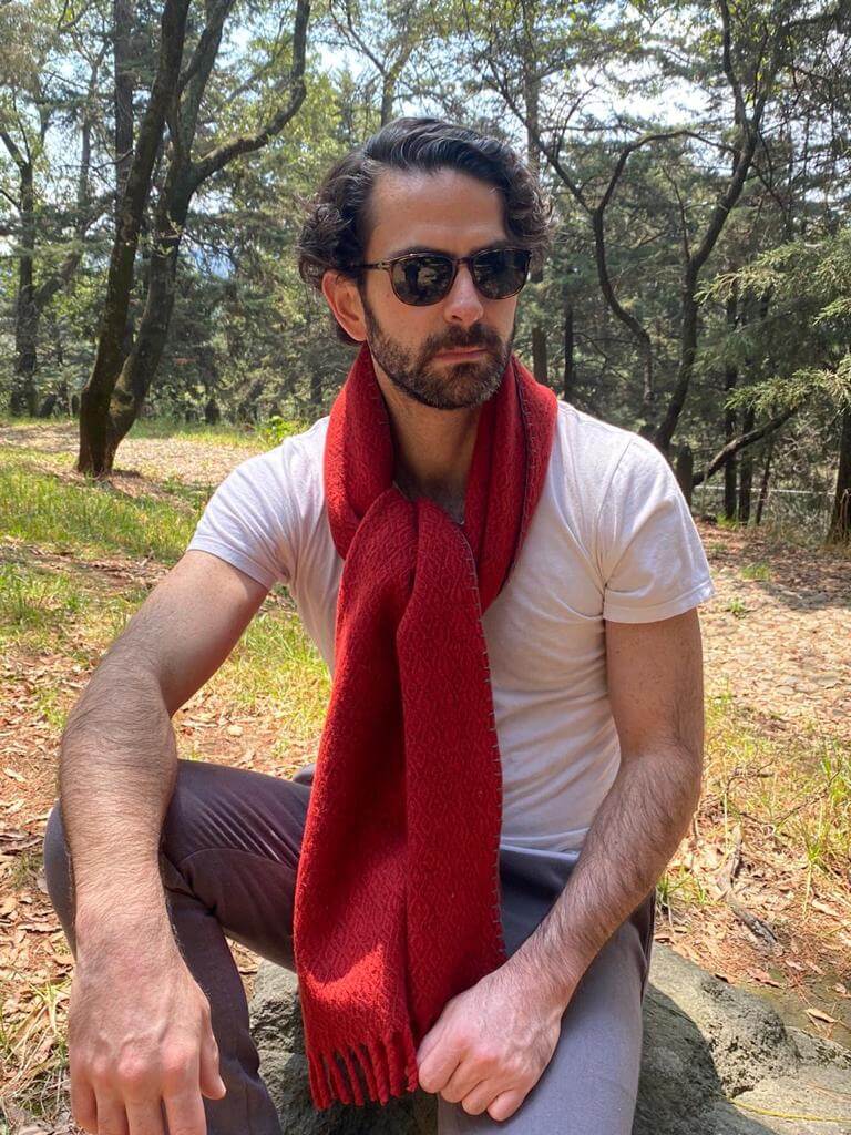 Bufanda con punta trenzada. El proceso artesanal de esta prenda consta de seis pasos: trasquila del borrego, cardado de la lana, hilado en malacate, tejido en telares de pedal, teñido a mano y acabado final. Elaborada por grupos mayas (tzeltales) de los Altos de Chiapas.