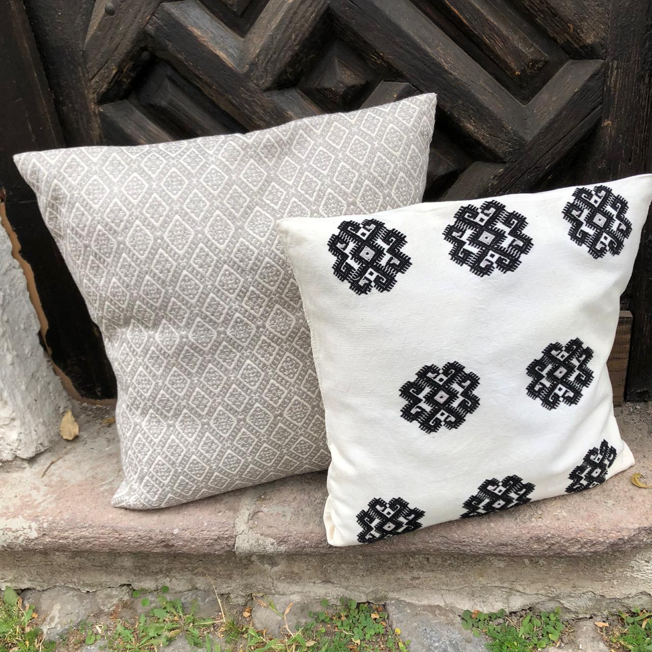 Cojín decorativo de algodón, tejido en telar de cintura por comunidades mayas (Tsotsiles) de Chiapas.