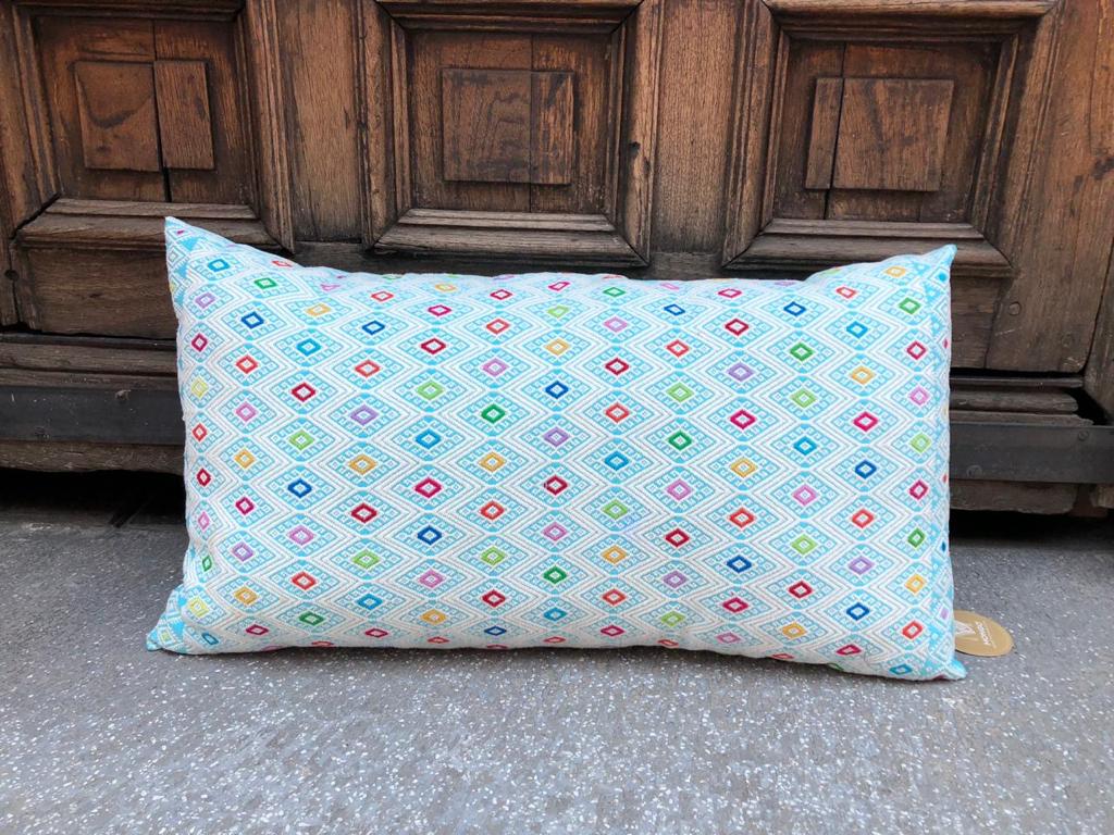 Cojín decorativo con brocado, tejido en telar de cintura por comunidades mayas (tsotsiles) de Chiapas.