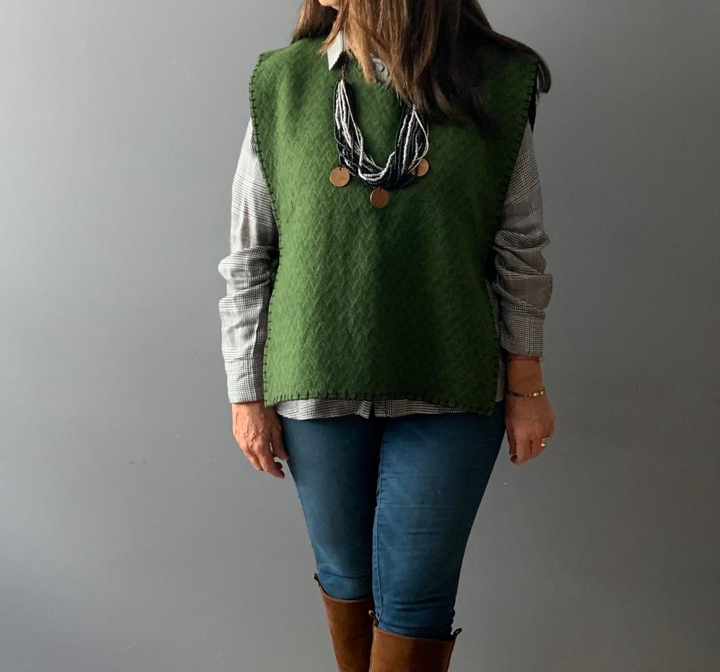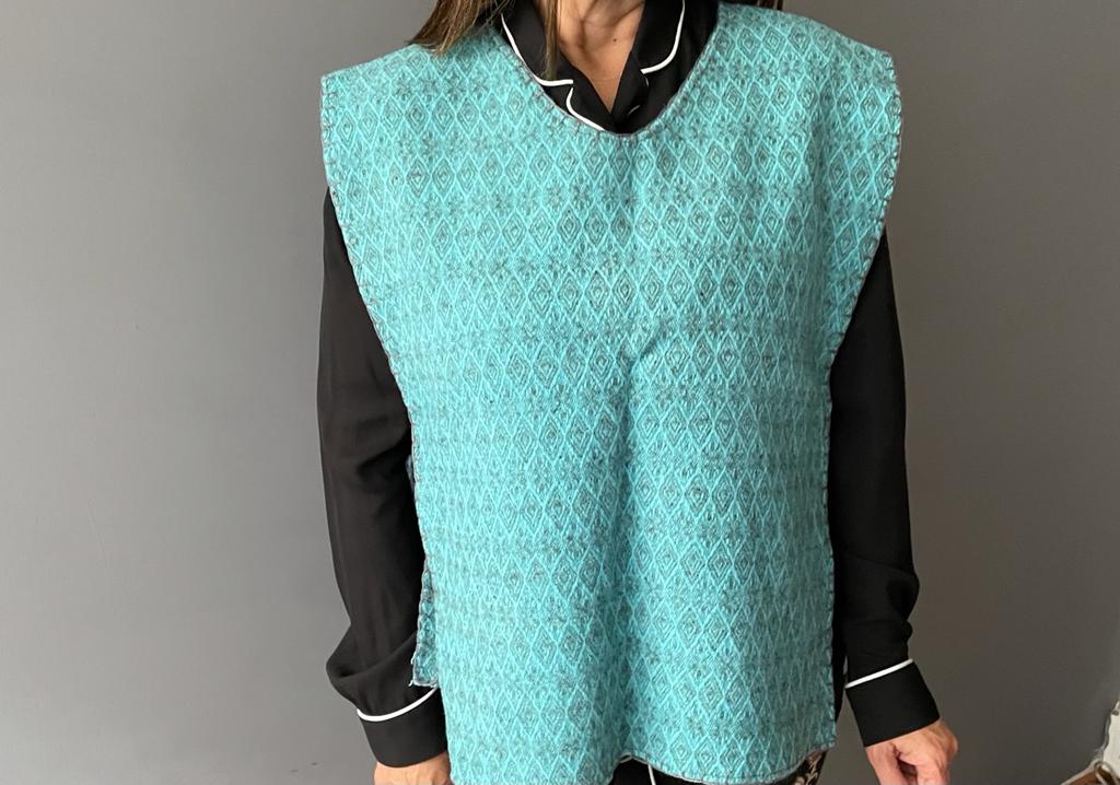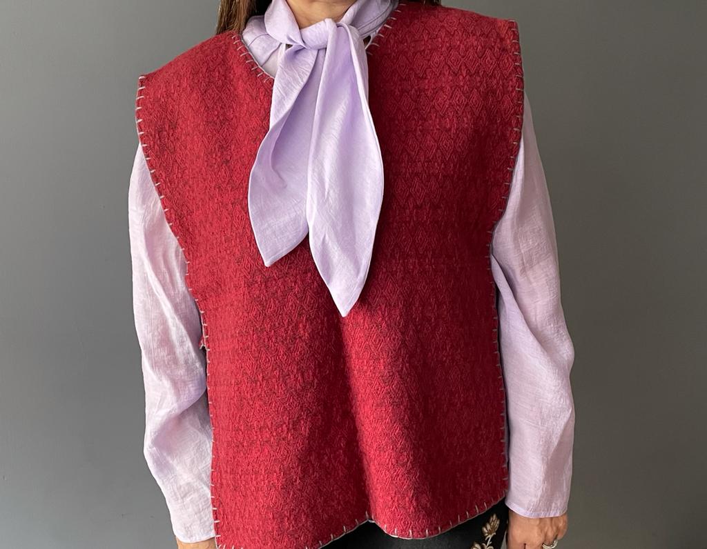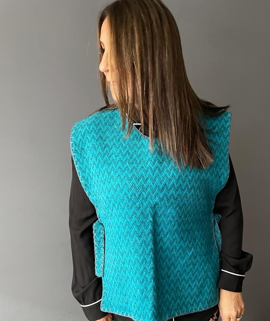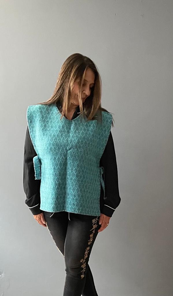 Chaleco con amarres laterales. El proceso artesanal de esta prenda consta de seis pasos: trasquila del borrego, cardado de la lana, hilado en malacate, tejido en telares de pedal, teñido a mano y acabado final. Elaborada por grupos mayas (tzeltales) de los Altos de Chiapas.