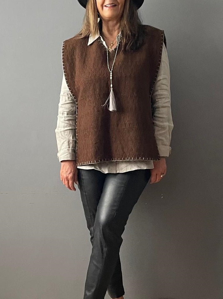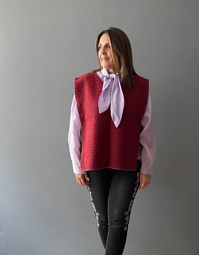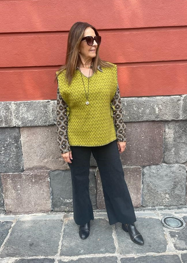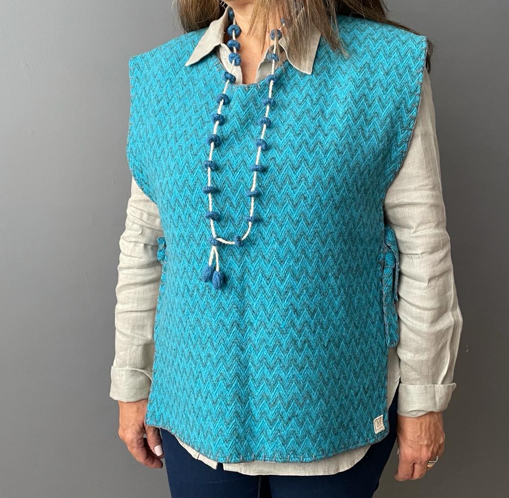 Chaleco con amarres laterales. El proceso artesanal de esta prenda consta de seis pasos: trasquila del borrego, cardado de la lana, hilado en malacate, tejido en telares de pedal, teñido a mano y acabado final. Elaborada por grupos mayas (tzeltales) de los Altos de Chiapas.