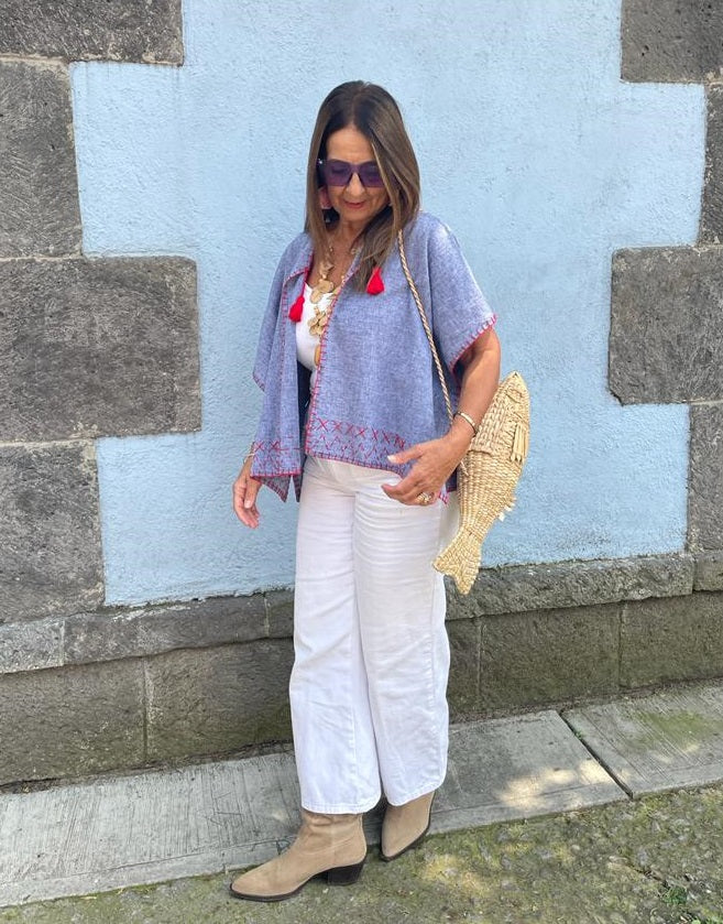 Saco de lino acabado mezclilla con pompones decorativos al frente y bordado de cruces a mano. Elaborada por grupos mayas (tzeltales) de los Altos de Chiapas.