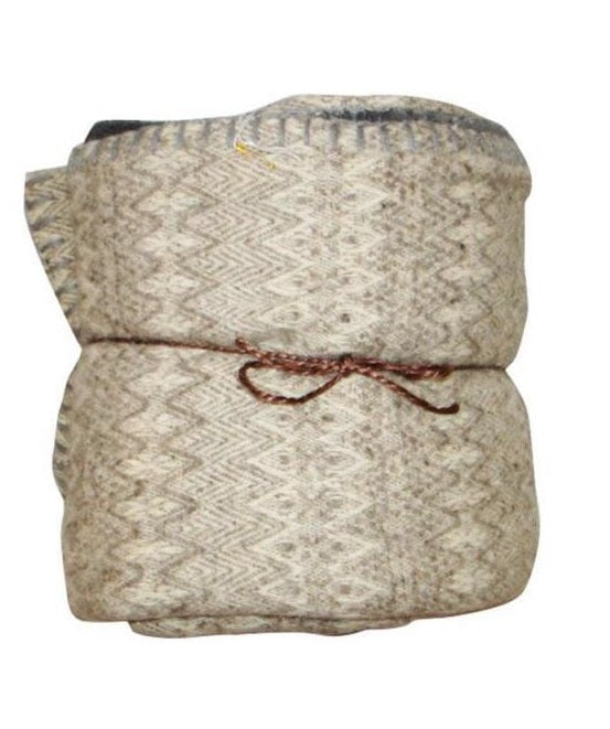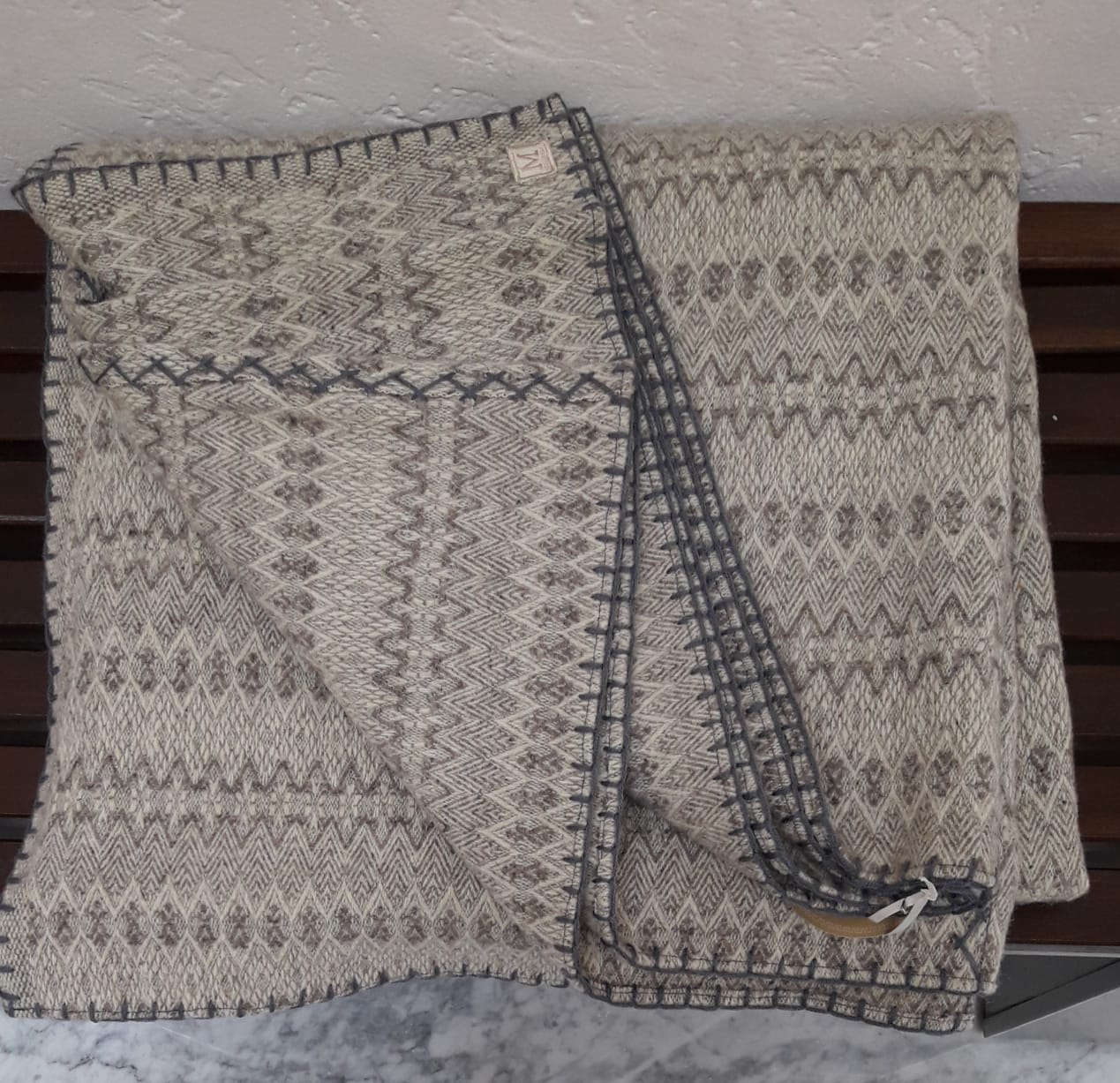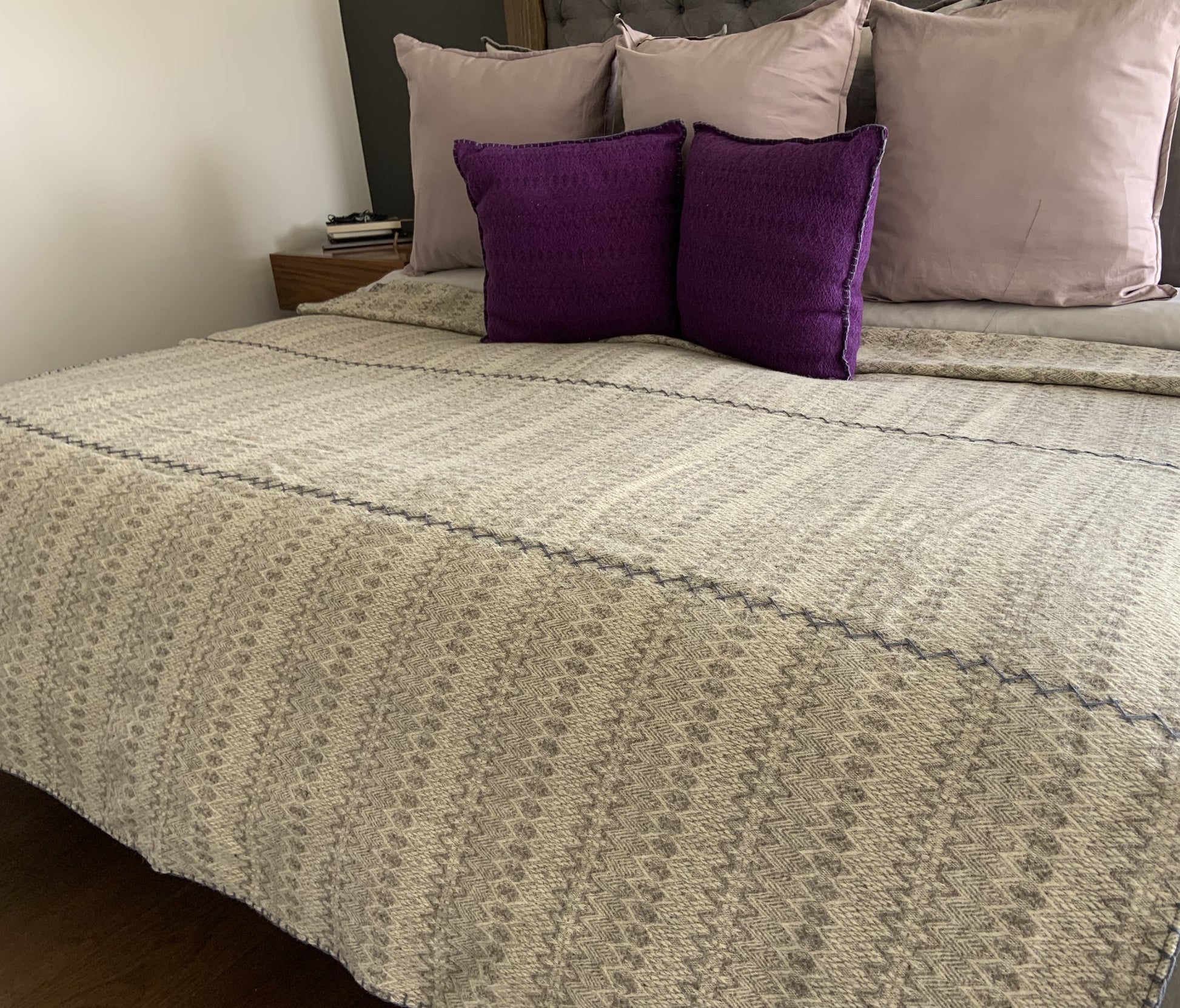 Frazada para cama con bordado sencillo. El proceso artesanal de esta prenda consta de seis pasos: trasquila del borrego, cardado de la lana, hilado en malacate, tejido en telares de pedal, teñido a mano y acabado final. Elaborada por grupos mayas (tzeltales) de los Altos de Chiapas.