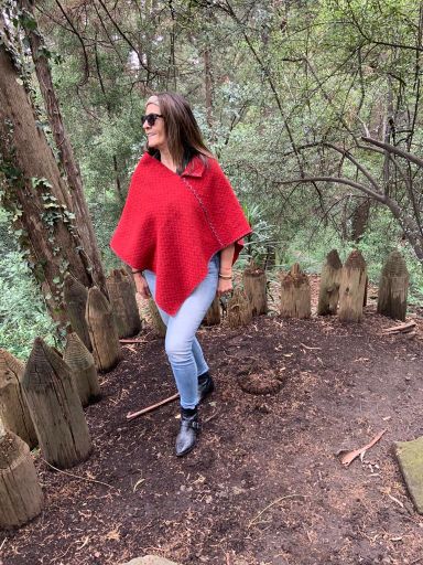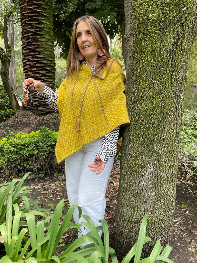 Prenda llamada tradicionalmente quexquémitl, cuya forma de rombo representa el universo. Tiene una abertura en el cuello de 30 cm y con un toque de innovación que permite colocar de dos maneras distintas. Detalles bordados a mano. Esta prenda tiene un proceso de elaboración de seis pasos: trasquila del borrego, cardado de la lana, hilado en malacate, tejido en telares de pedal, teñido a mano y acabado final. Elaborada por grupos mayas (tzeltales) de los Altos de Chiapas.