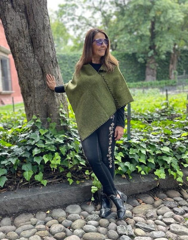 Prenda llamada tradicionalmente quexquémitl, cuya forma de rombo representa el universo. Tiene una abertura en el cuello de 30 cm y con un toque de innovación que permite colocar de dos maneras distintas. Detalles bordados a mano. Esta prenda tiene un proceso de elaboración de seis pasos: trasquila del borrego, cardado de la lana, hilado en malacate, tejido en telares de pedal, teñido a mano y acabado final. Elaborada por grupos mayas (tzeltales) de los Altos de Chiapas.