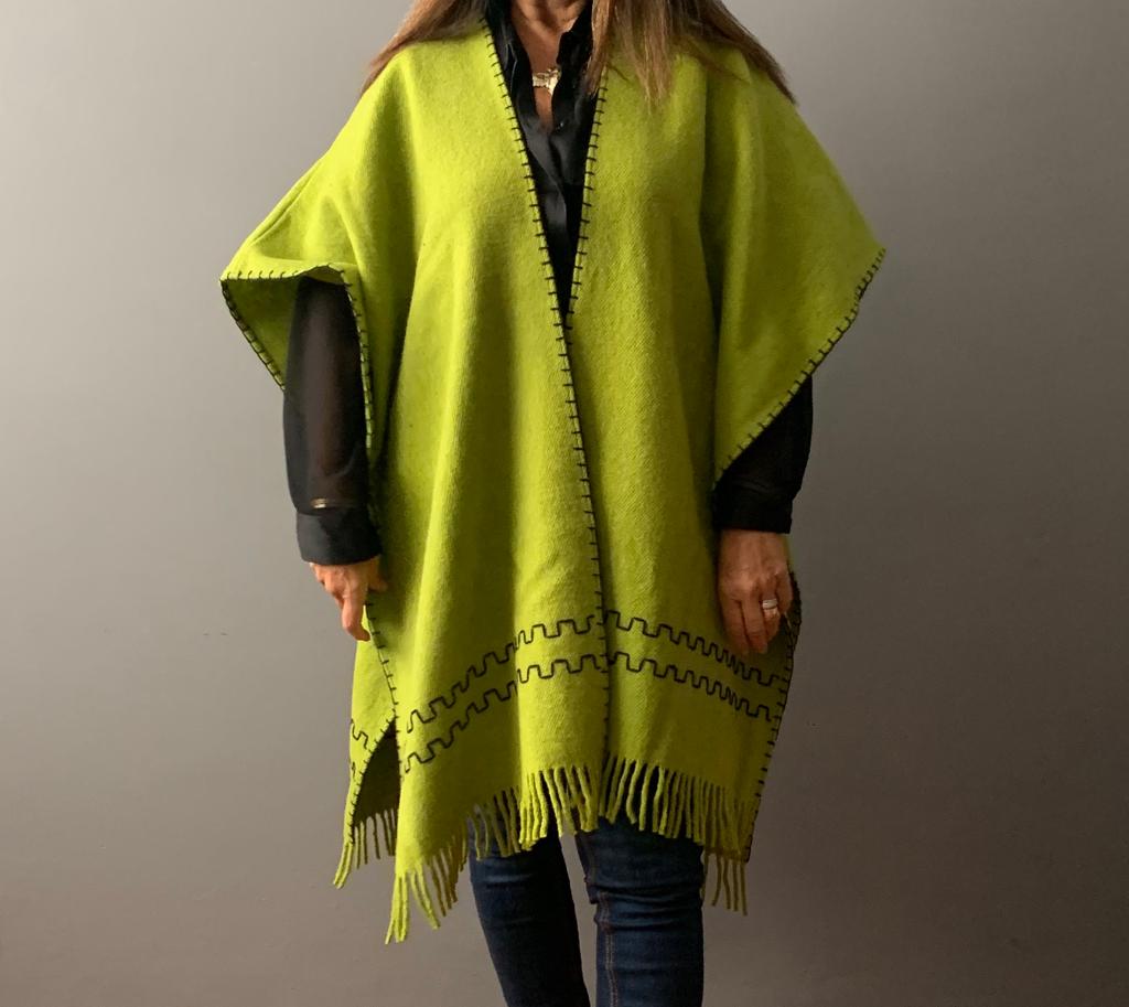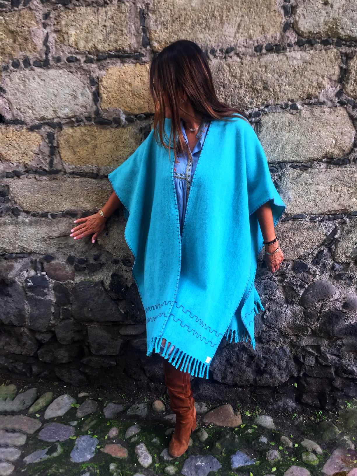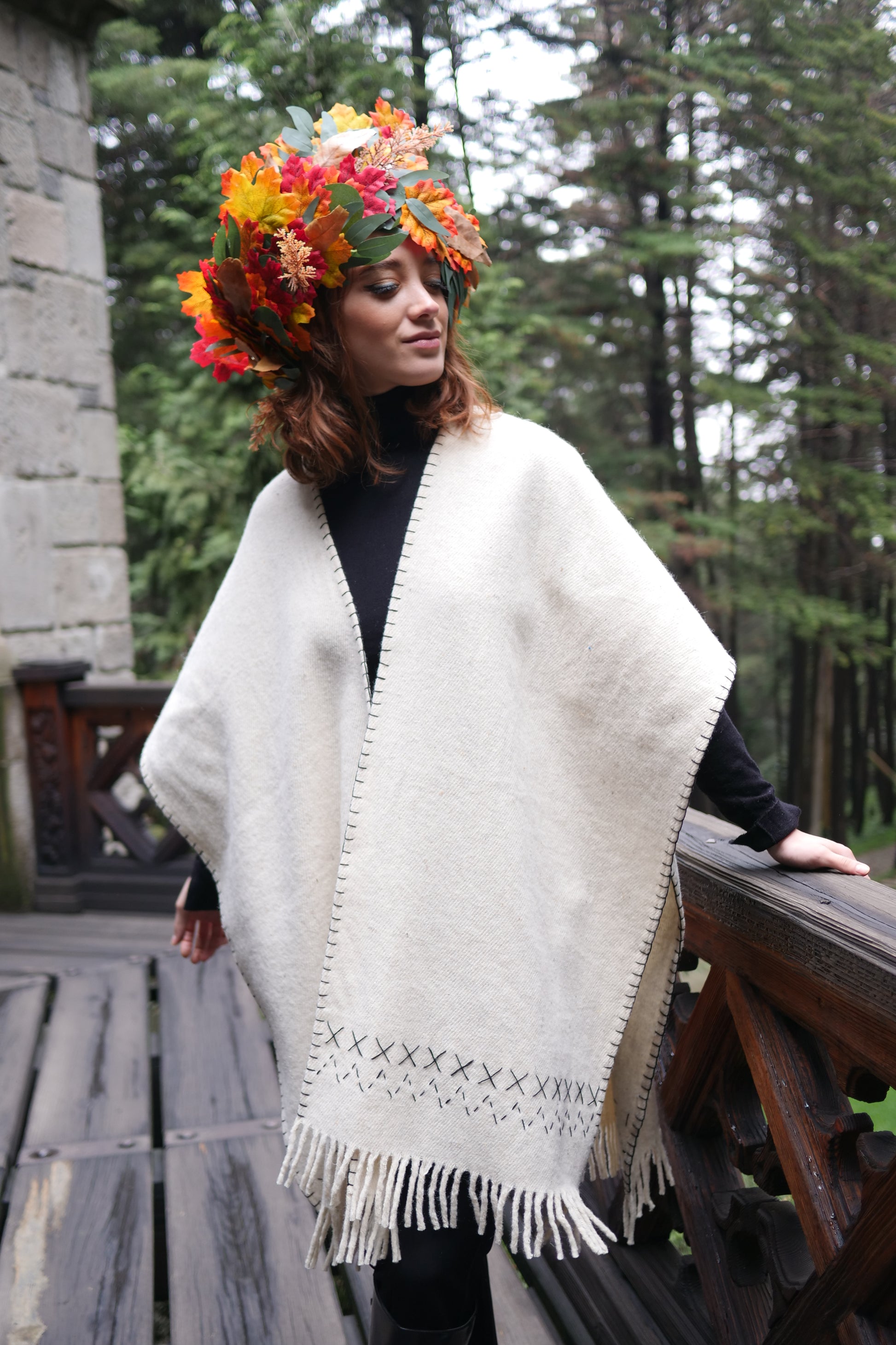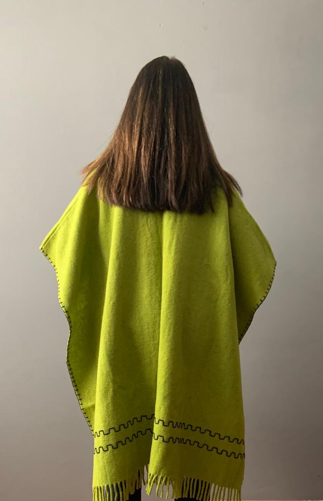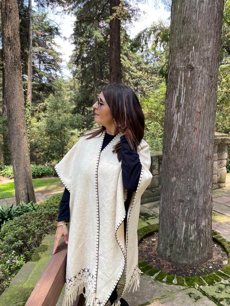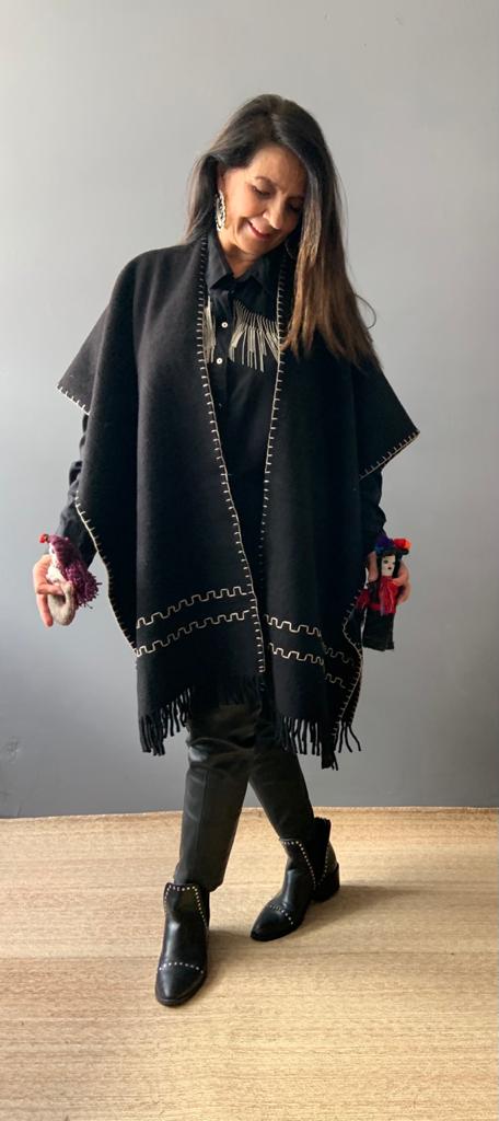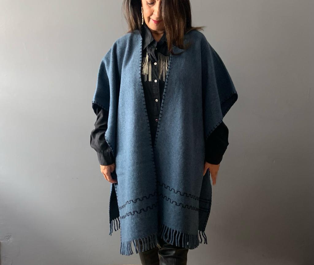 Ruana con flecos y bordado a mano. Es una prenda cuyo proceso artesanal consta de seis pasos: trasquila del borrego, cardado de la lana, hilado en malacate, tejido en telares de pedal, teñido a mano y acabado final. Elaborada por grupos mayas (tzeltales) de los Altos de Chiapas.