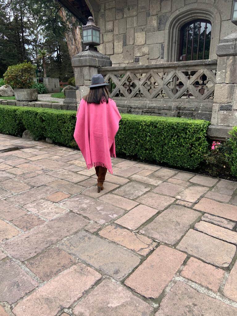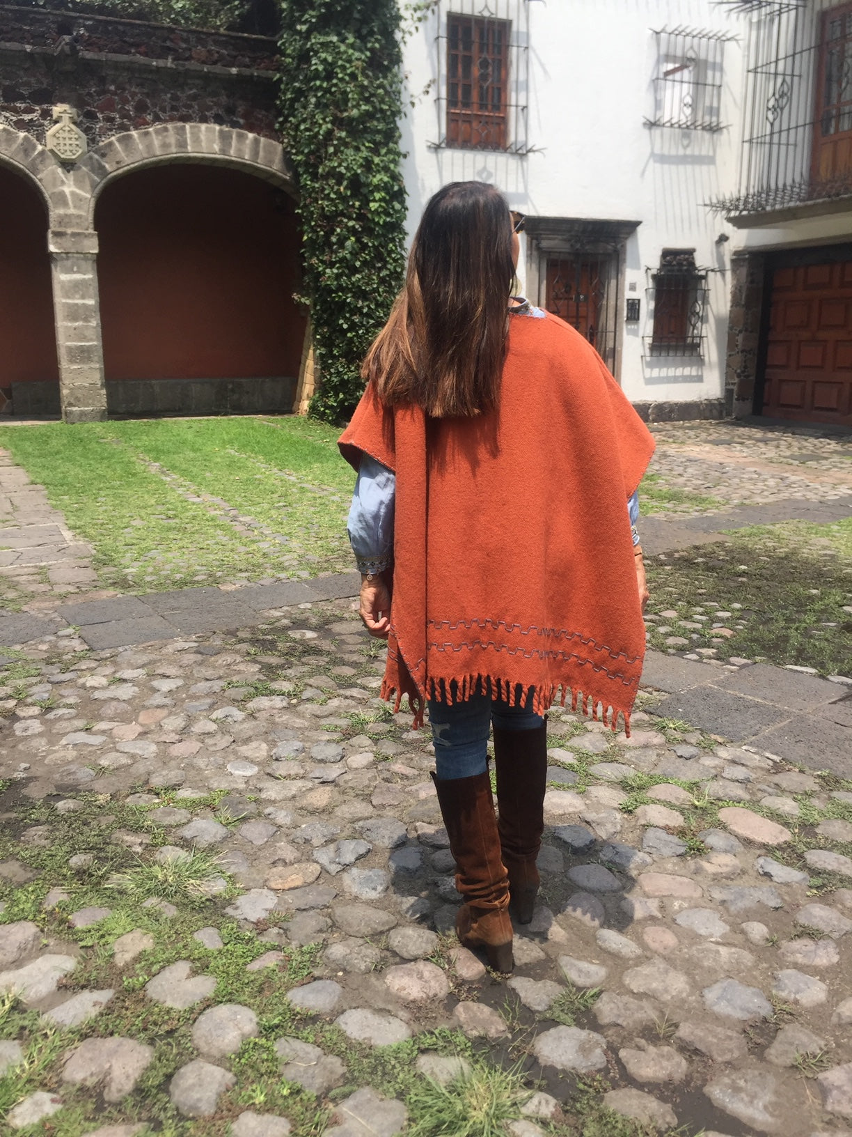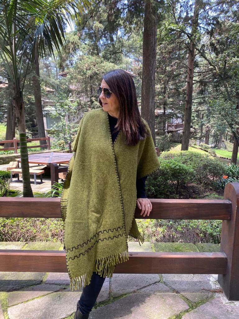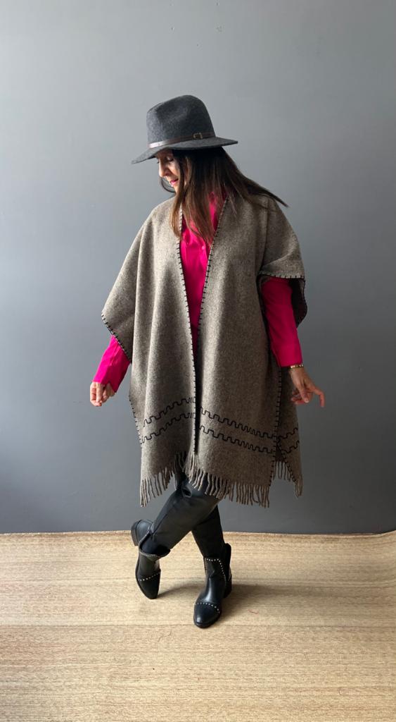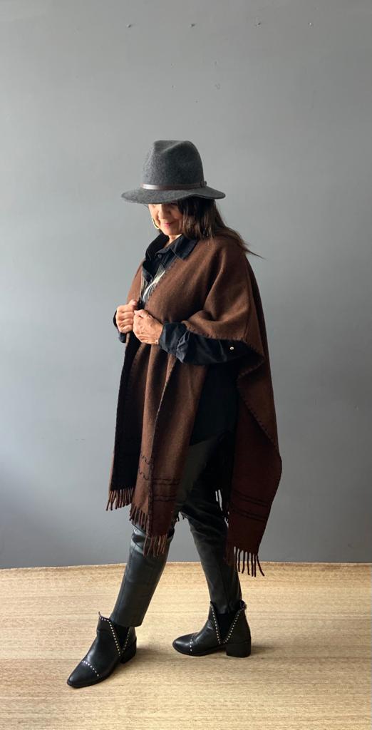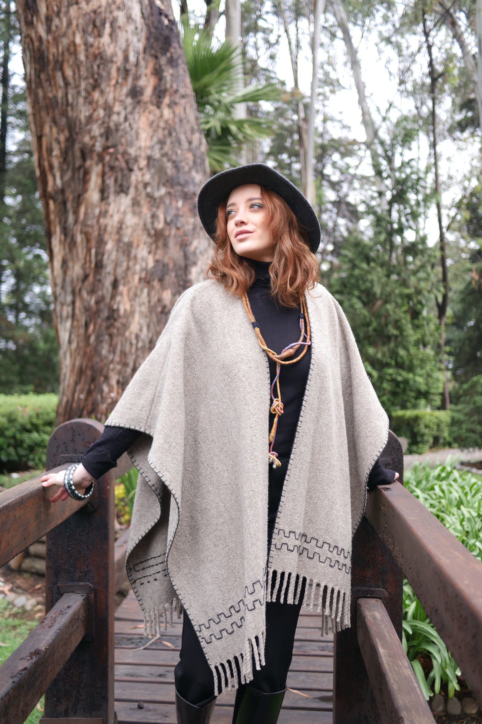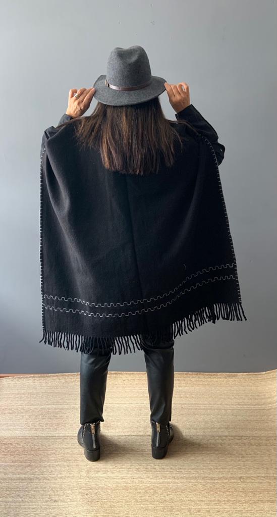 Ruana con flecos y bordado a mano. Es una prenda cuyo proceso artesanal consta de seis pasos: trasquila del borrego, cardado de la lana, hilado en malacate, tejido en telares de pedal, teñido a mano y acabado final. Elaborada por grupos mayas (tzeltales) de los Altos de Chiapas.