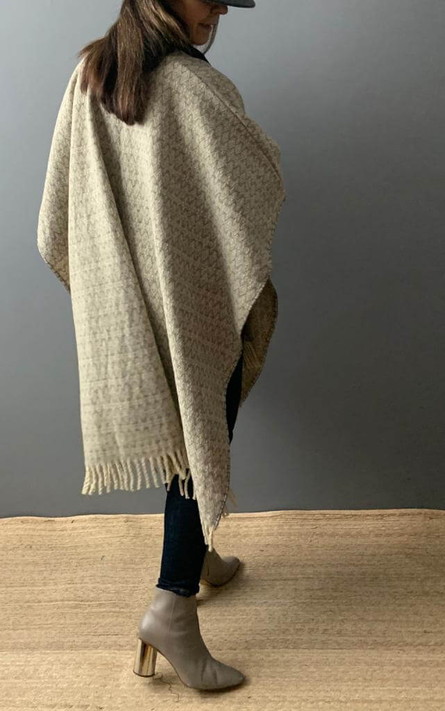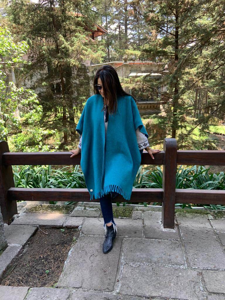 Ruana con flecos y bordado a mano. Es una prenda cuyo proceso artesanal consta de seis pasos: trasquila del borrego, cardado de la lana, hilado en malacate, tejido en telares de pedal, teñido a mano y acabado final. Elaborada por grupos mayas (tzeltales) de los Altos de Chiapas.