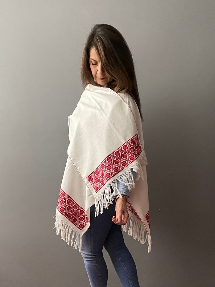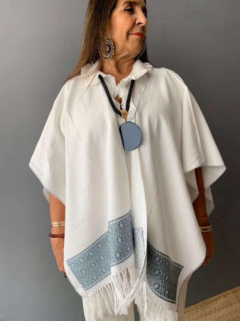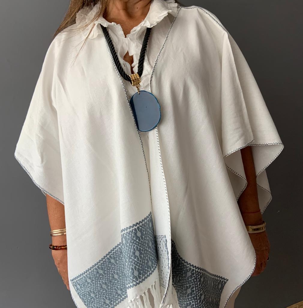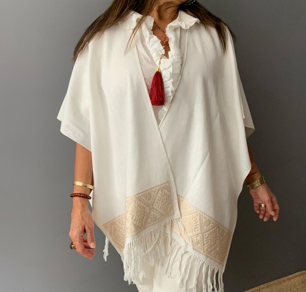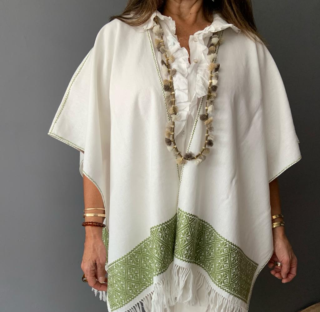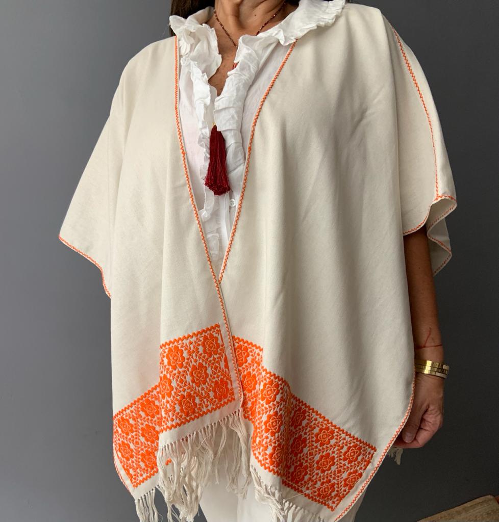 Ruana Lino bordado a mano con hilos de algodón sobre lino por comunidad Nahua, de la Sierra Norte de Puebla.