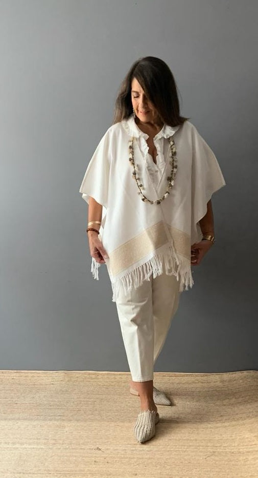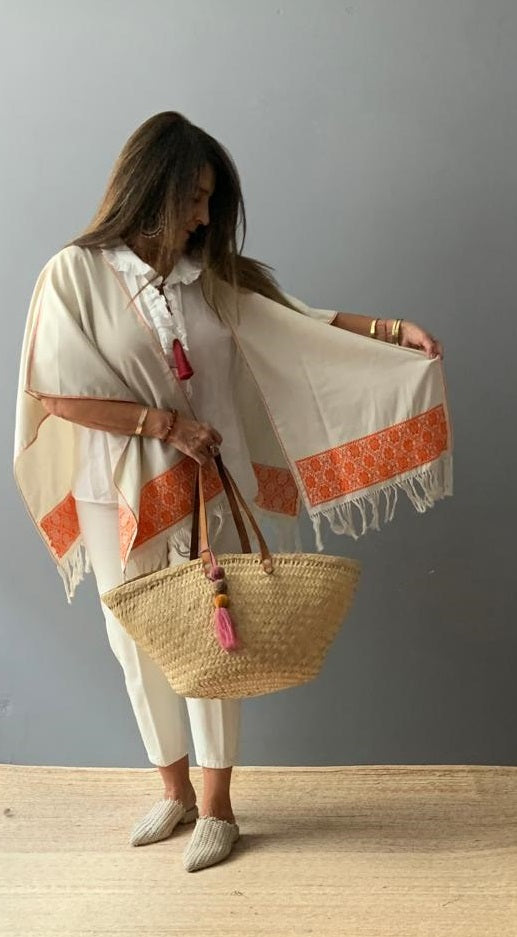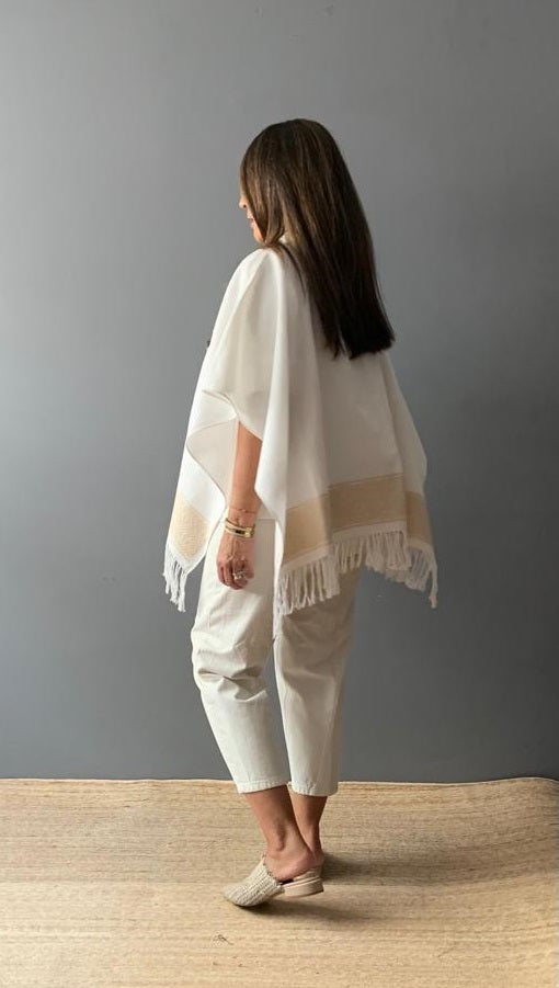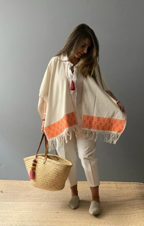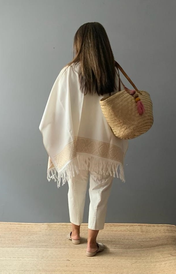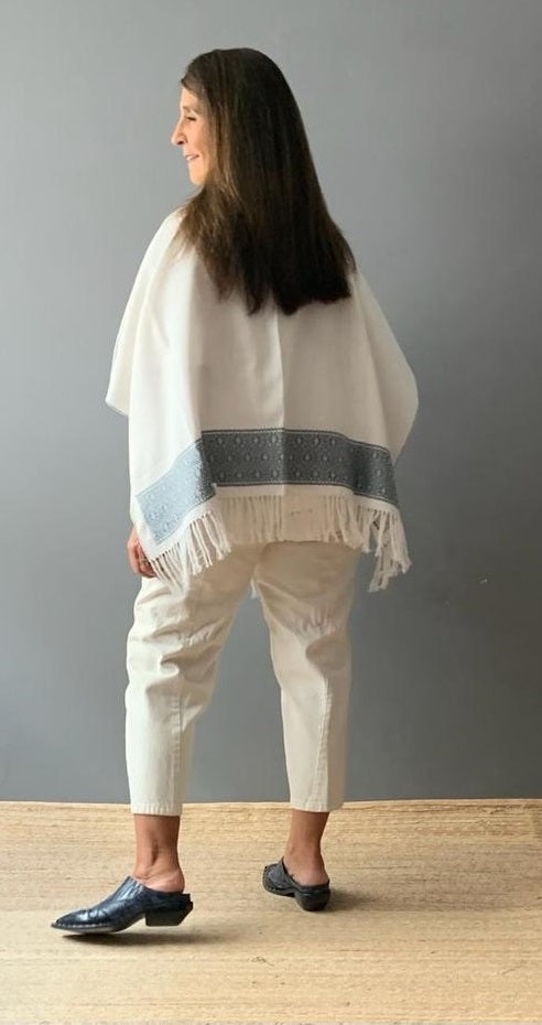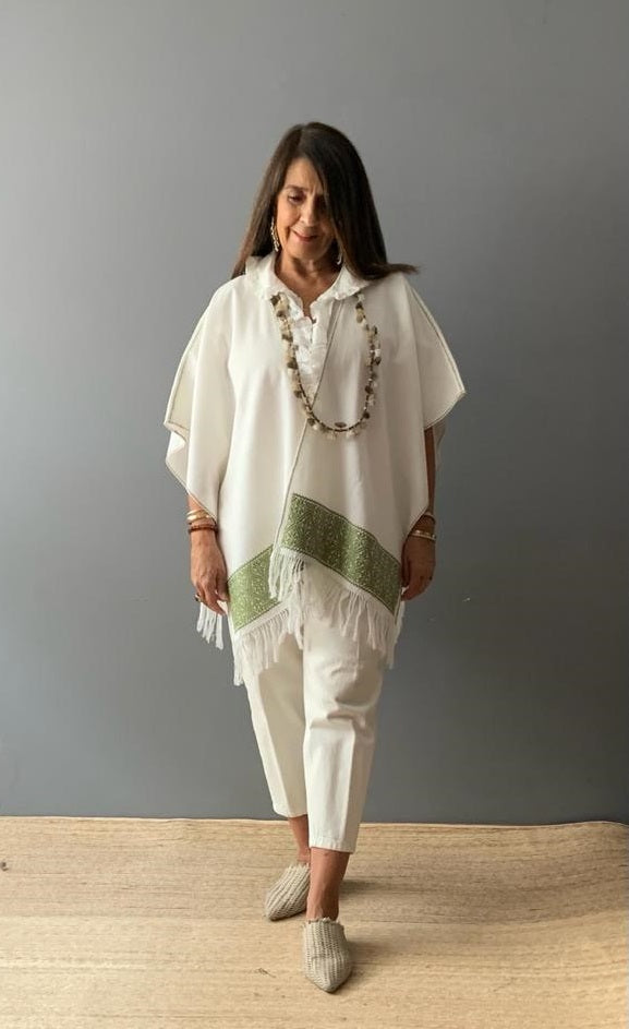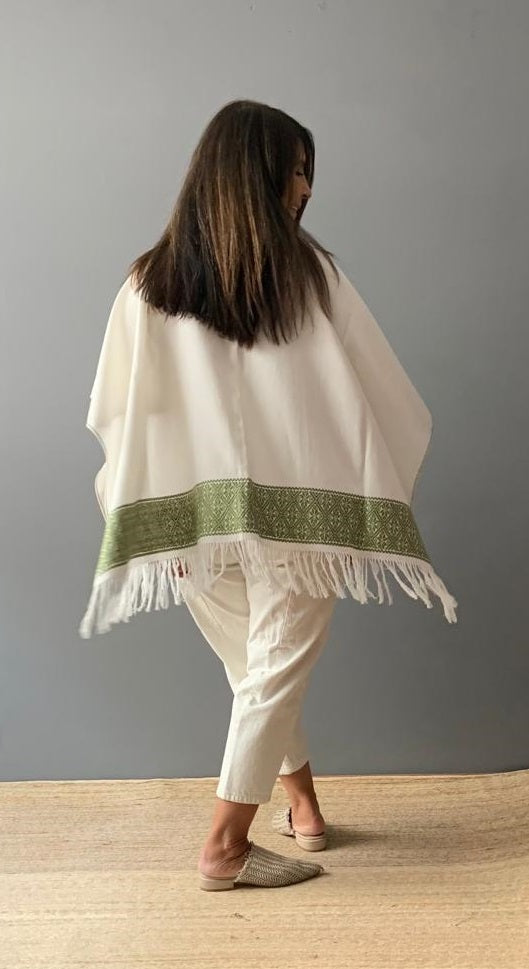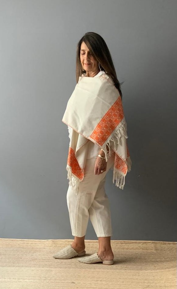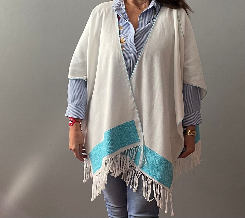 Ruana Lino bordado a mano con hilos de algodón sobre lino por comunidad Nahua, de la Sierra Norte de Puebla.